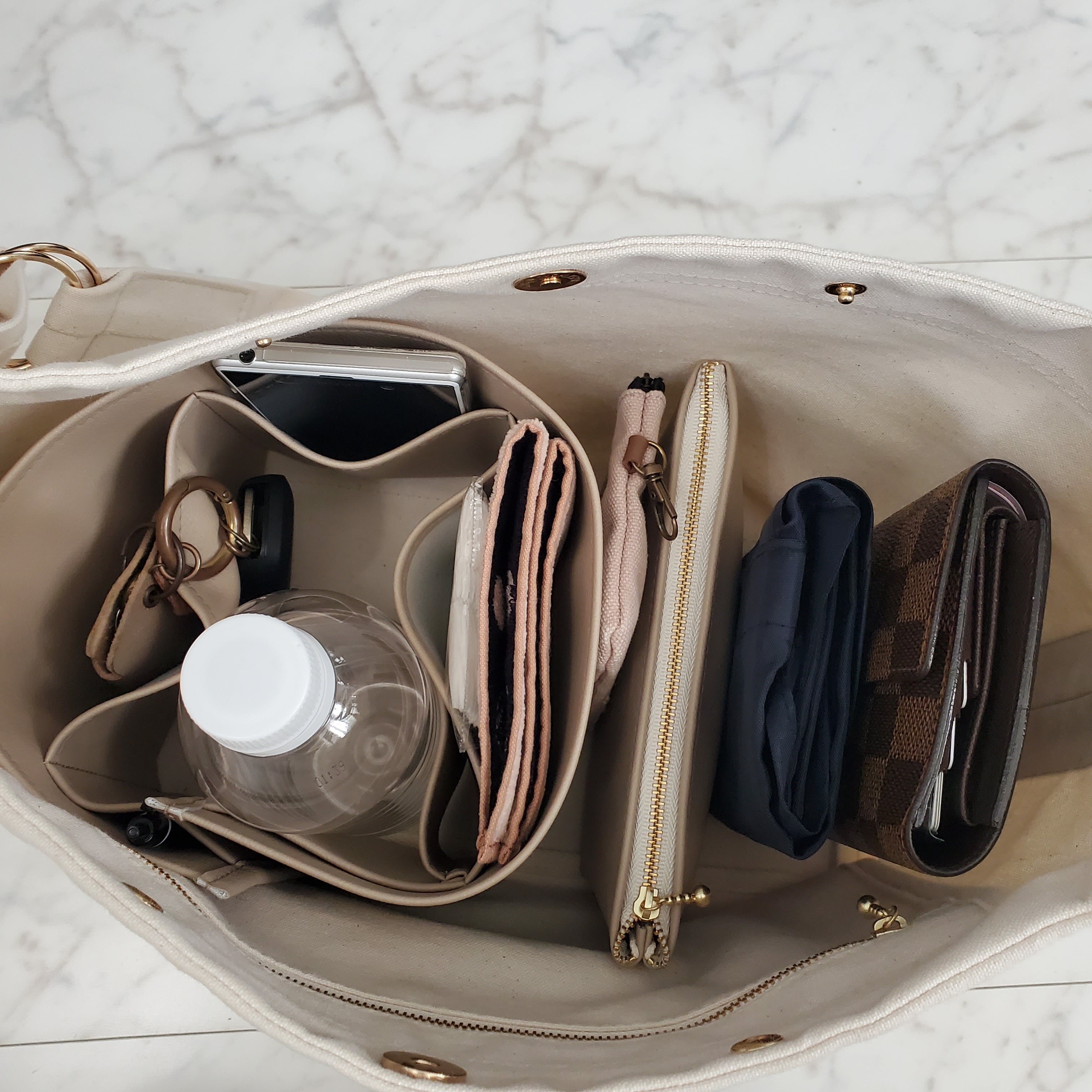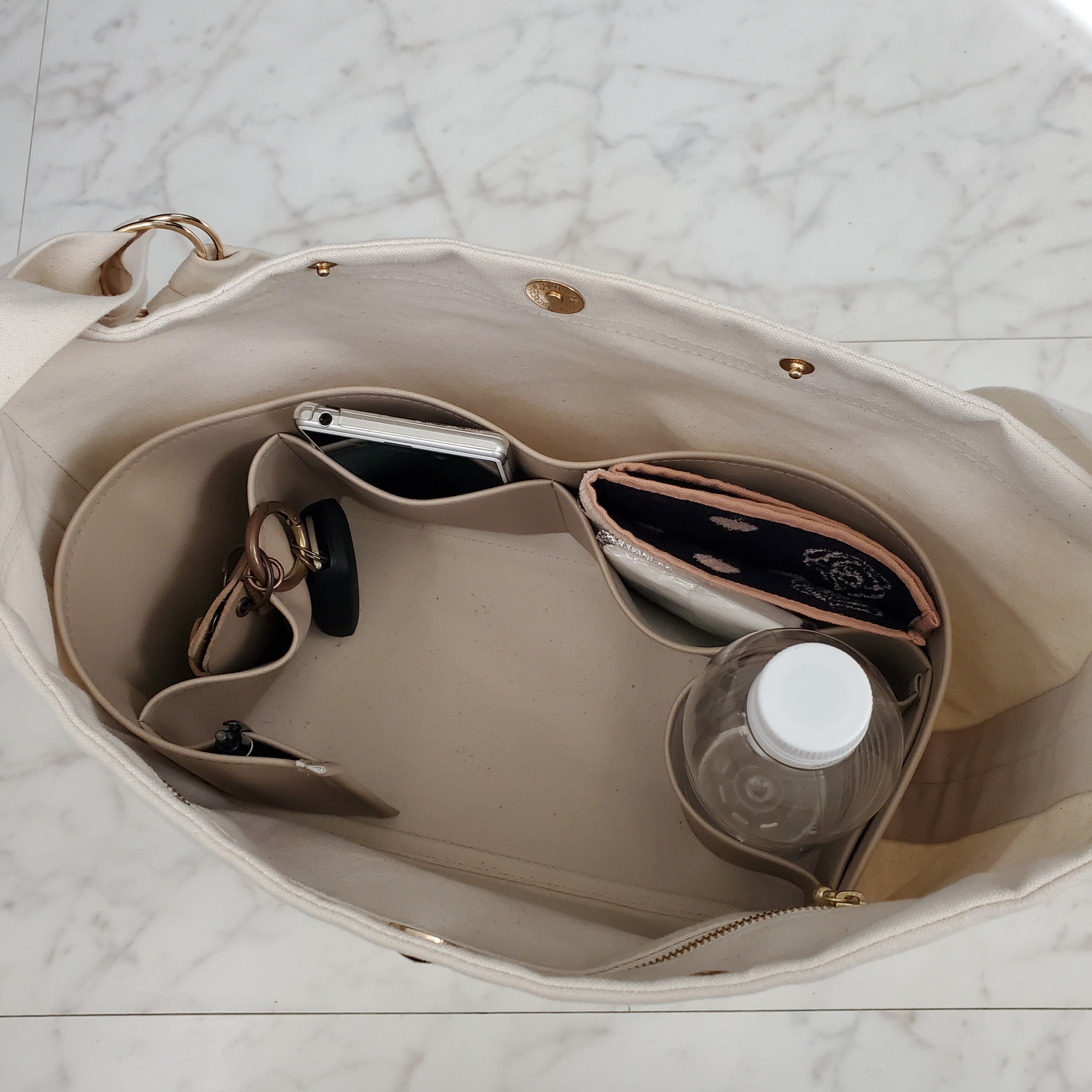 バッグの中が整頓できる仕切りポケット [fit フィット] 大好評の帆布タイプに加えてフェイクレザータイプを製作しました。